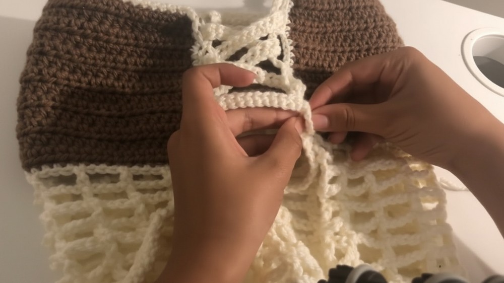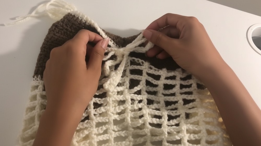 - Continue the mesh stitch rows for as many rows as needed (e.g., 12 rows for cropped fit). Insert hook into the spaces (not stitches) from previous rows.
