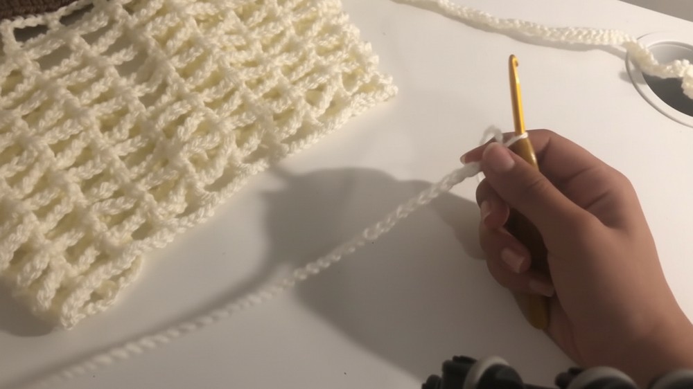 - Skip 3 stitches, double crochet into the fourth stitch—this creates the first mesh “window.”