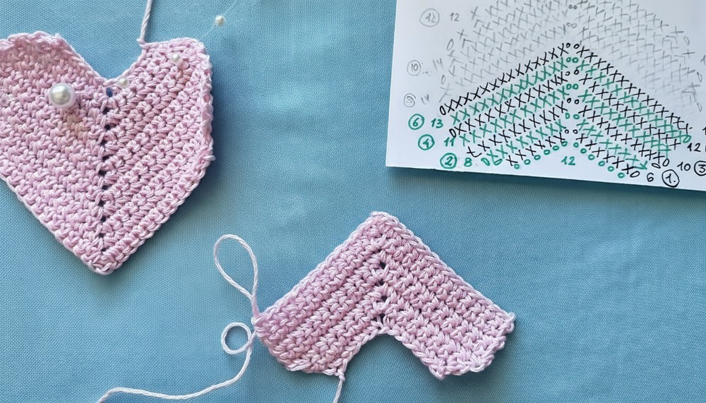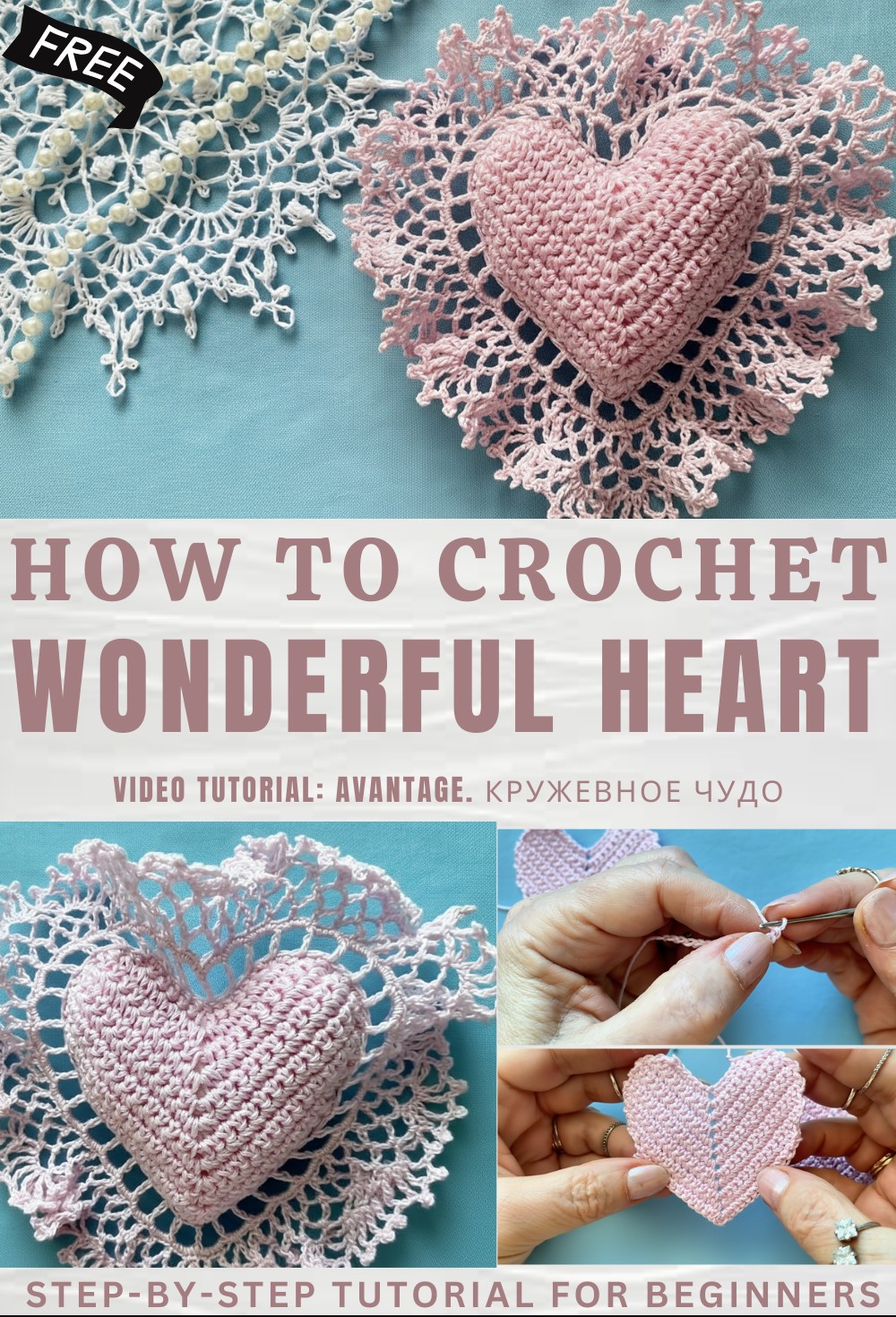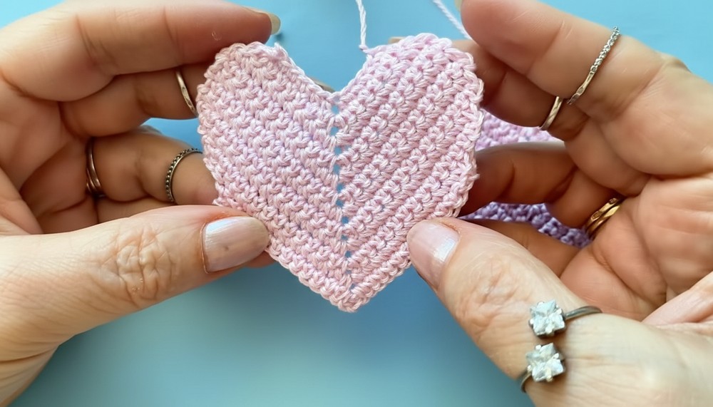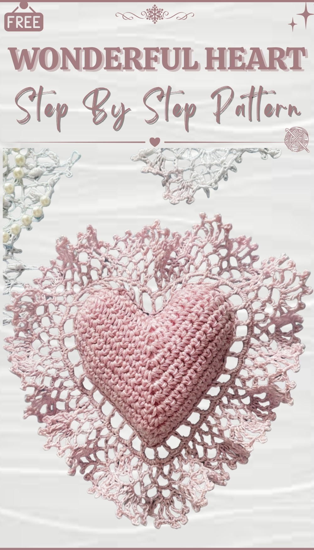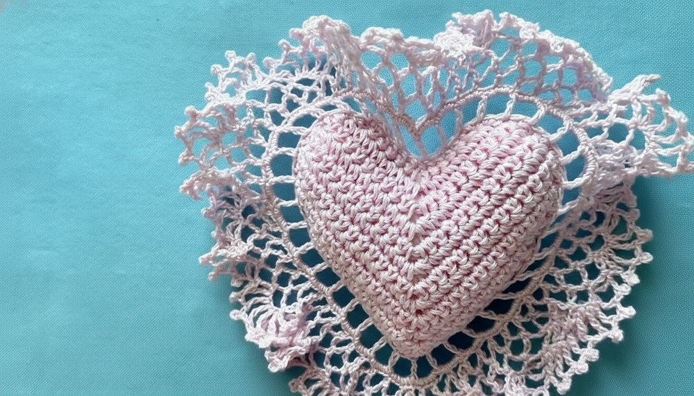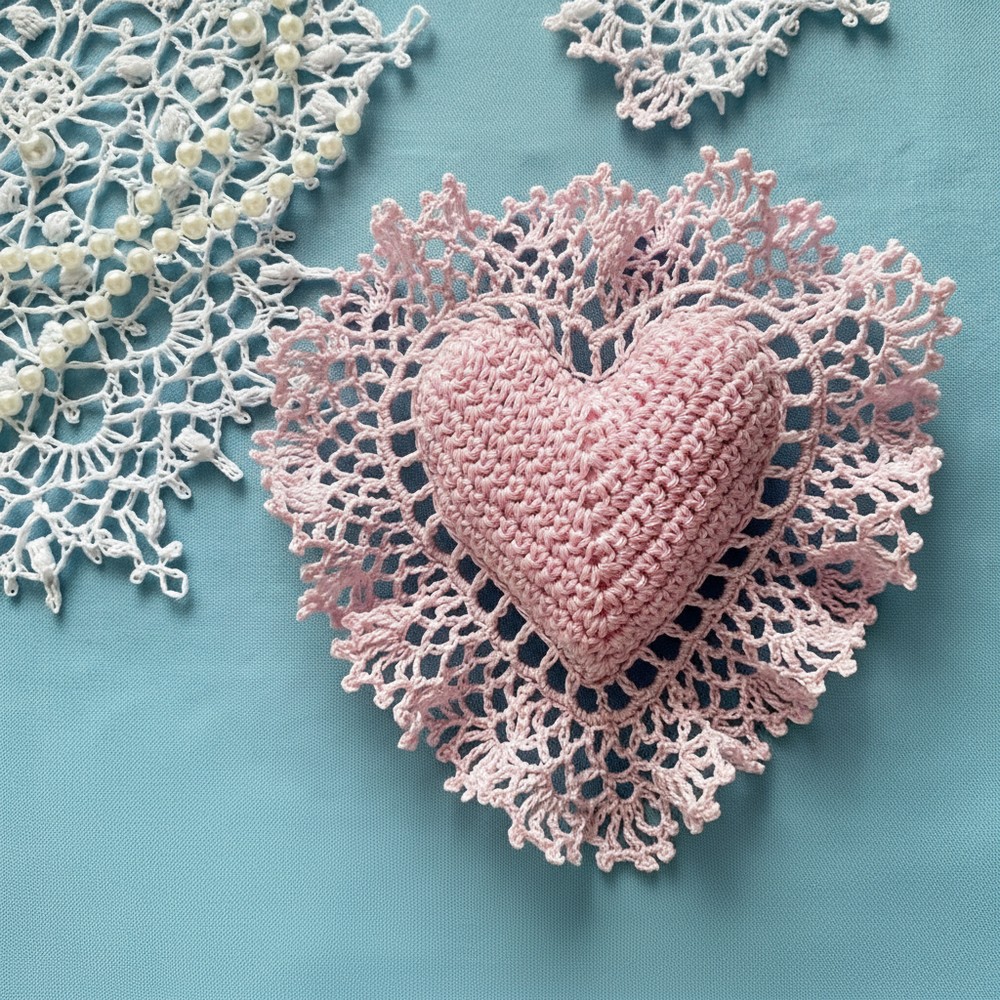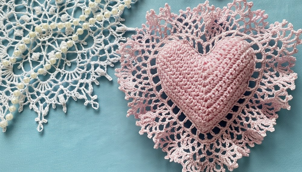 - You will crochet two symmetrical heart halves, join them, fill, and embellish with a lace border.