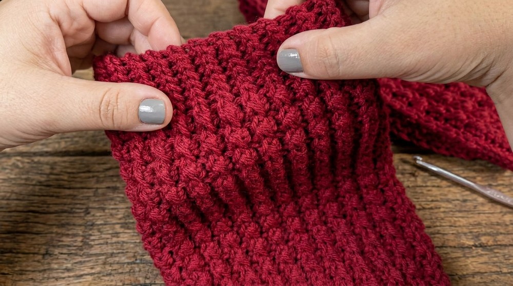 - The faux-knit rib stitch alternates hdc and sl st (both through BLO) for the main body.