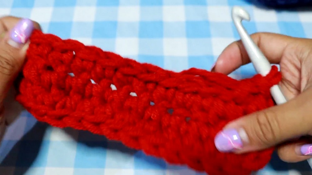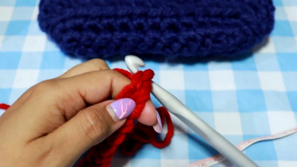 - The first row is worked in single crochet stitches along both sides of the initial chain. The last stitch on each end of the base has three single crochets in it to create the rounded corners.