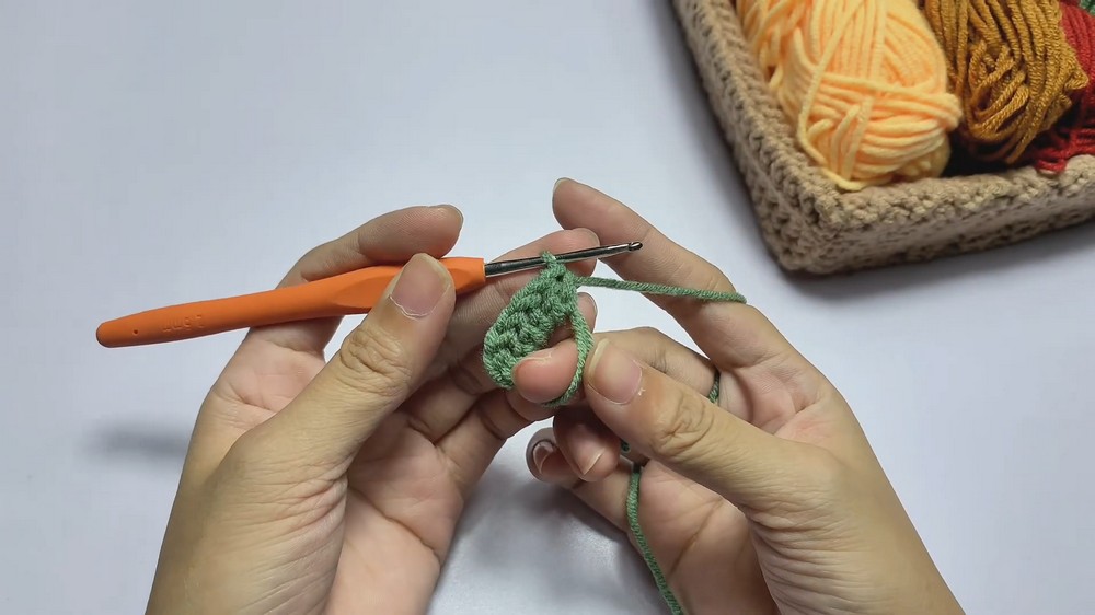 Chains: Crochet three separate chains of different lengths using green yarn to act as the “limbs” and the main hanger. [20:14]