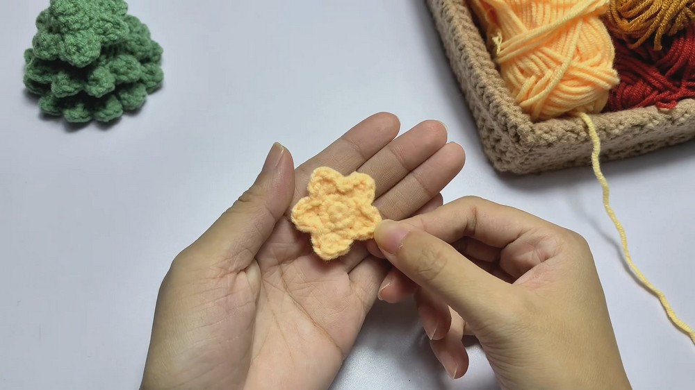 The tutor recommends hiding your yarn tails inside the body of the pieces as you go to keep the tiny parts looking neat. When gluing the star, ensure the “seam” or starting point faces downward so it remains hidden under the hat or behind the tree. [20:23]