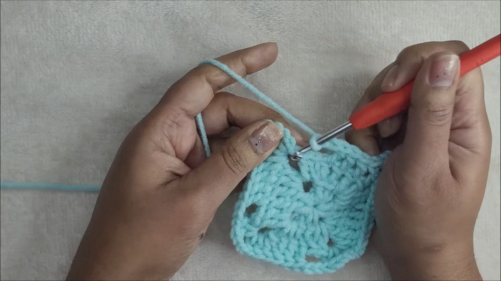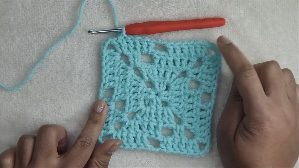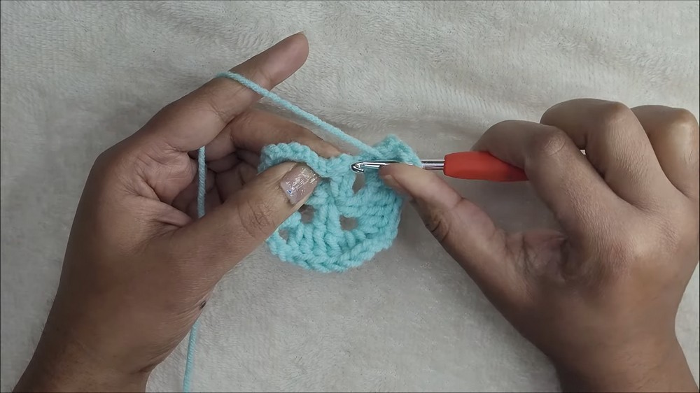 - Work the first row of double crochets and chains to establish a simple square structure with corner spaces.