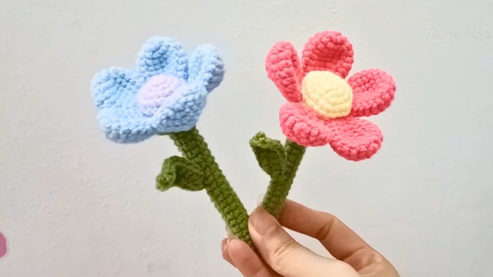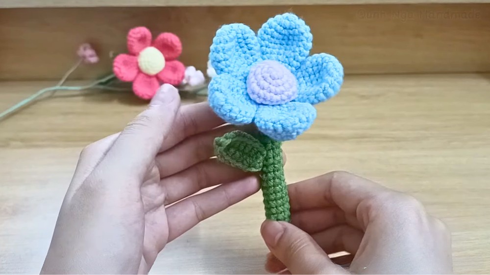 Finally, the video demonstrates how to assemble all the crocheted parts, including sewing the petals to the center, attaching the flower to the stem with a wire for support, and sewing the leaf onto the stem. So, follow through with us for the complete tutorial.