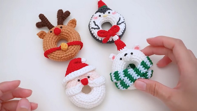 Most of these assorted Christmas rings are for beginners like grinch and wreath once you understand basic donut crochet pattern. Each character can be distinguished by adding both specific character features and the Christmas accessories like Santa hat, scarf and bows.