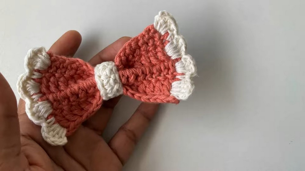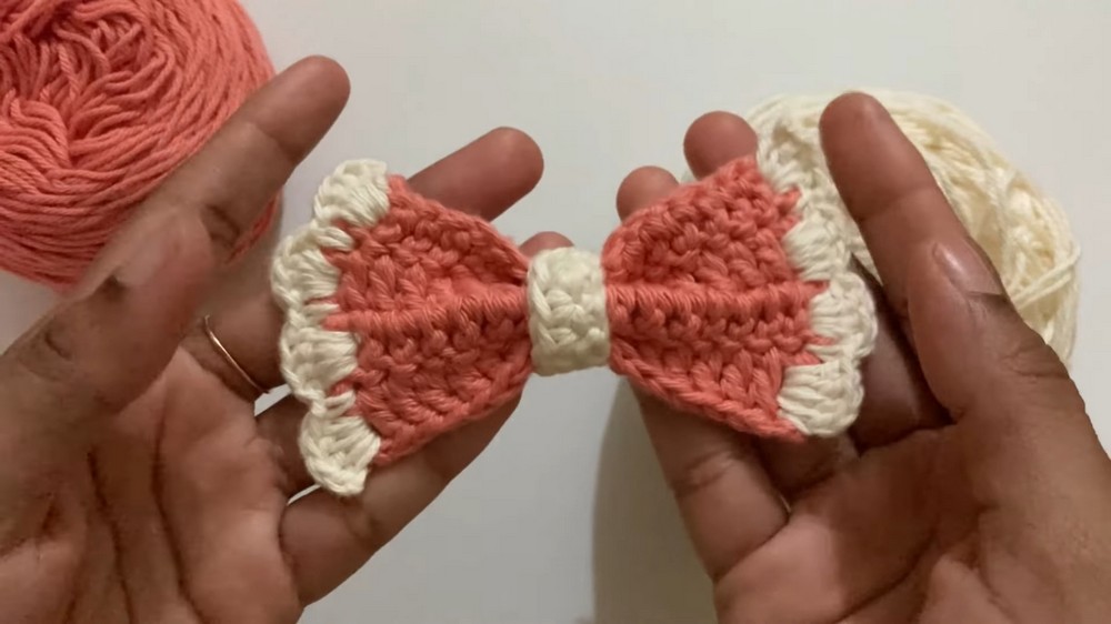 - The bow is crafted using peach and off-white cotton yarn with a 3.5mm crochet hook and double-thickness yarn to give it structure.