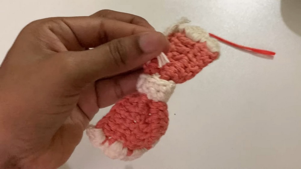 - Using the off-white yarn, a narrow band is crocheted for the center tie.