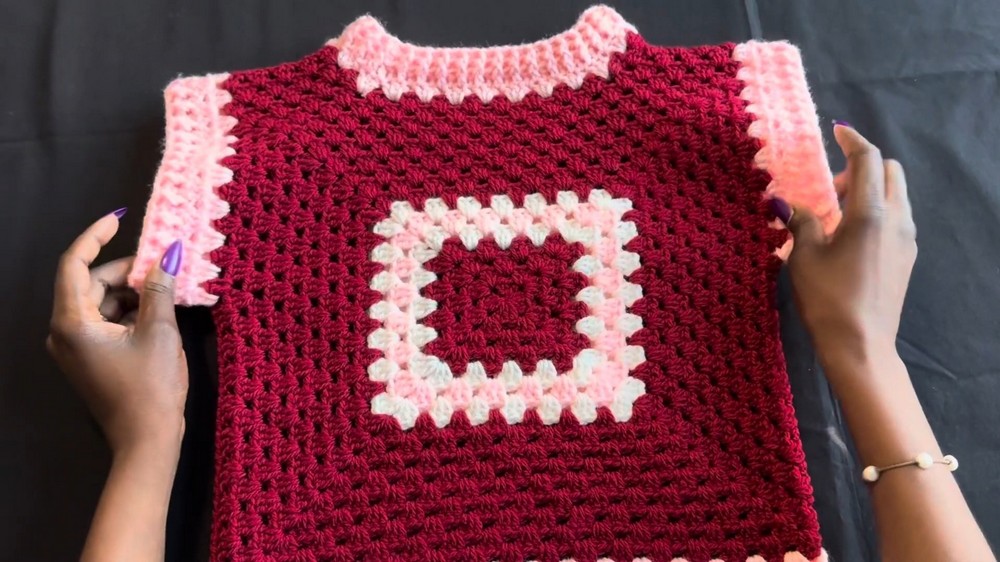 - Rows of granny stitches followed by double crochets are worked around the armholes for structure.