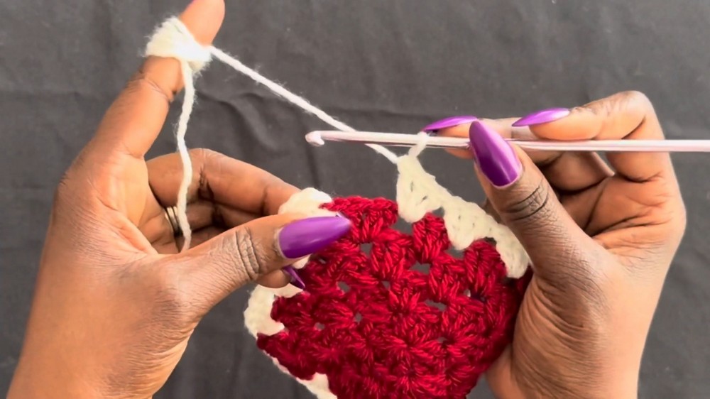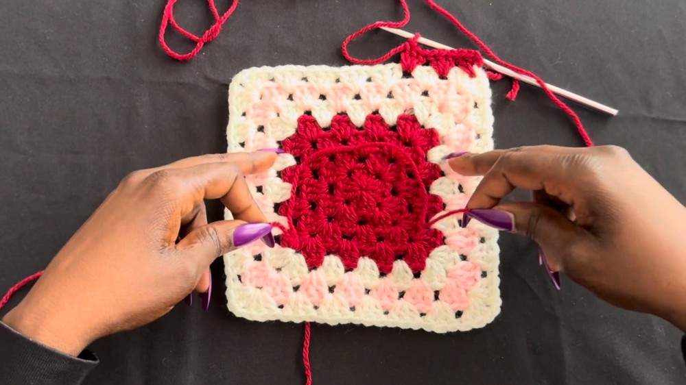 - After completing four rows in the red yarn, Angel introduces color changes to the granny square, shifting to white and pink rows. Proper color-changing techniques are shown to ensure seamless transitions without visible gaps.