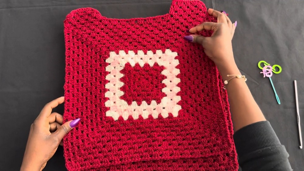 - The final component includes extending the top-most rows in red yarn to reach the desired panel size. The granny square panel size is determined based on personal measurements for a snug or loose fit.