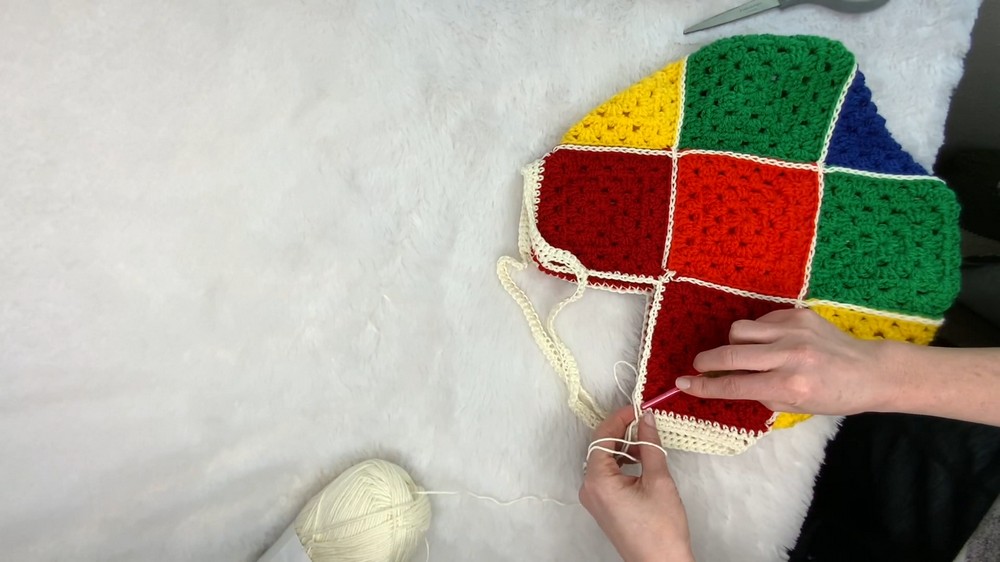 - Begin with long rows of squares, joining back loops only to ensure a sturdy and neat seam.