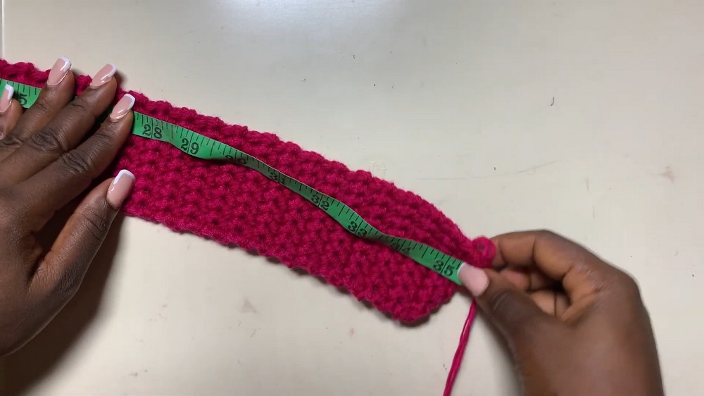 - Using single crochet stitches, the instructor shows how to create the bag’s long base panel.