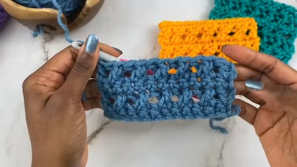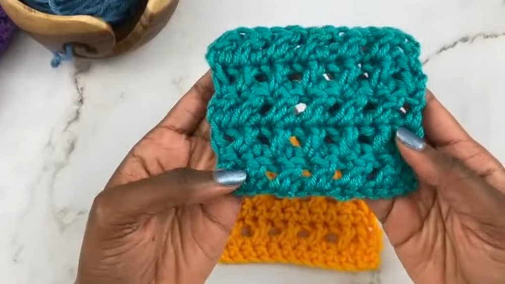 The creator begins by showcasing two different swatches of the back cross double crochet stitch. One swatch includes a row of single crochet stitches worked in between each row of back cross double crochet, while the other does not.