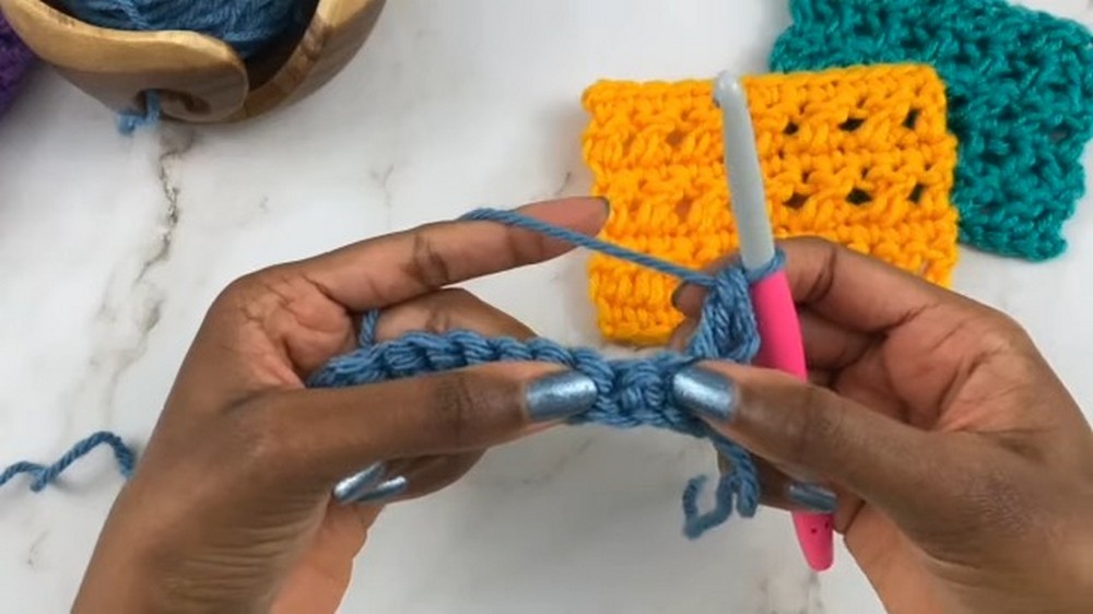 Row 1 (Single Crochet): The first row is established with single crochet stitches. The creator instructs viewers to work a single crochet into the second chain from the hook and then into each subsequent stitch across the row. A key tip provided is to work into the bottom bump of the chains, which creates a neater and more stable edge.