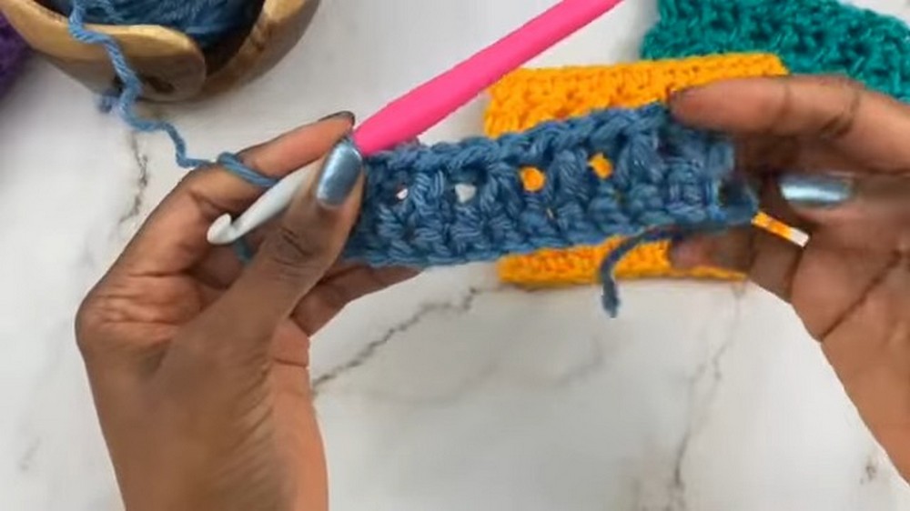 Row 3 (Single Crochet): This row serves as the intermediate row that the creator prefers for stitch definition. It begins with a chain one and turning the work, followed by working a single crochet stitch all the way across the row.