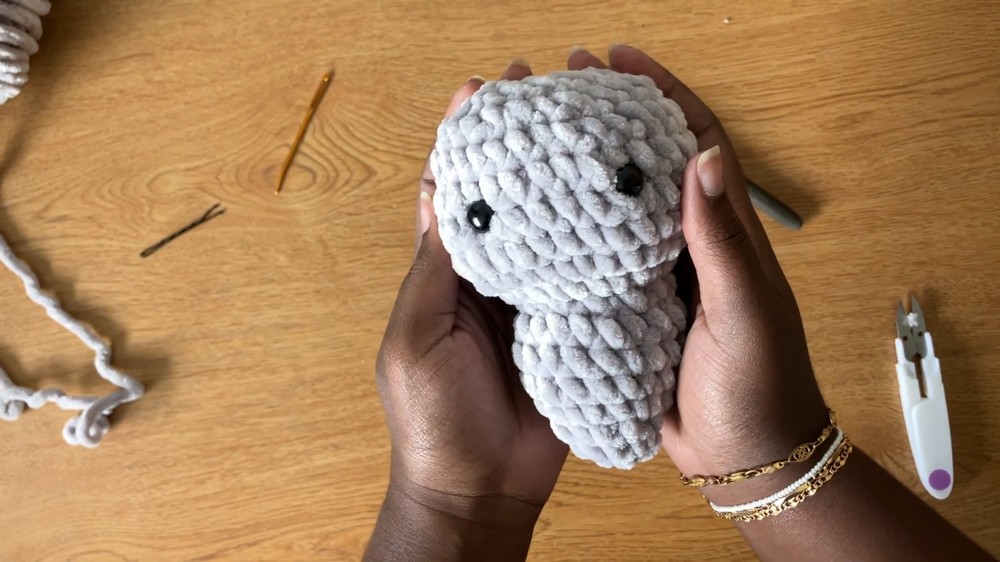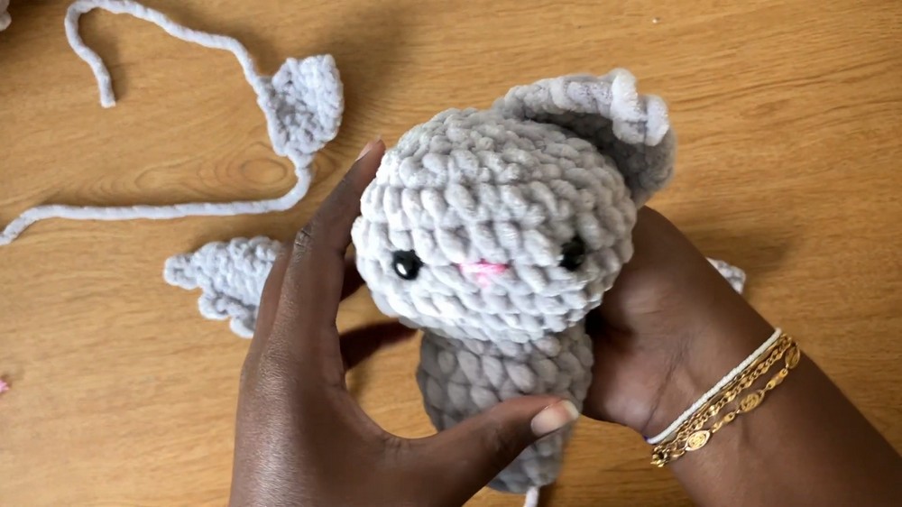 - Attaching Parts: Kyra attaches the ears and wings to the plushie using a yarn needle and long tails left from the crochet process.