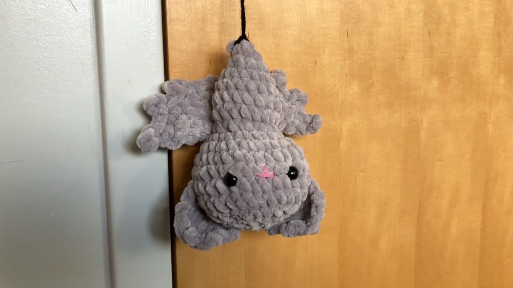 - Secure and Finish: She secures knots, hides loose ends, and positions the parts symmetrically to create the finished bat plushie.