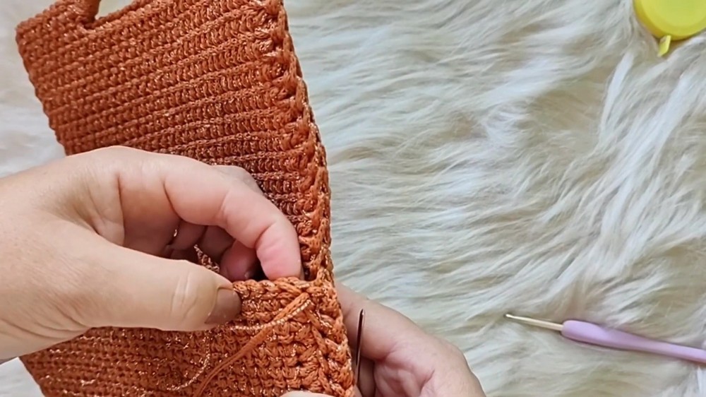- Fernanda uses a strong sewing thread matching the clutch’s yarn to ensure durability.