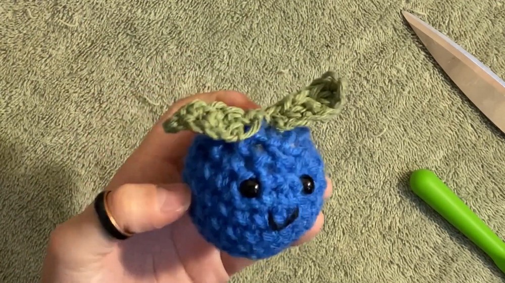 - Attaching Leaves: The leaves are secured to the top of the blueberry using a yarn needle. The tutorial suggests adding one or more leaves based on personal preference.