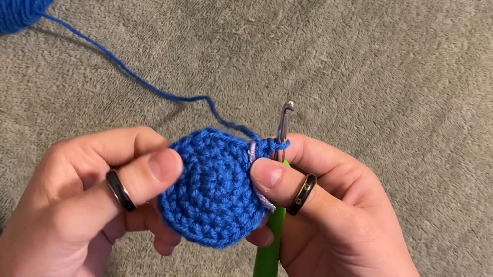 - After forming the magic ring, the next step involves creating rounds of single crochet stitches to shape the blueberry.
