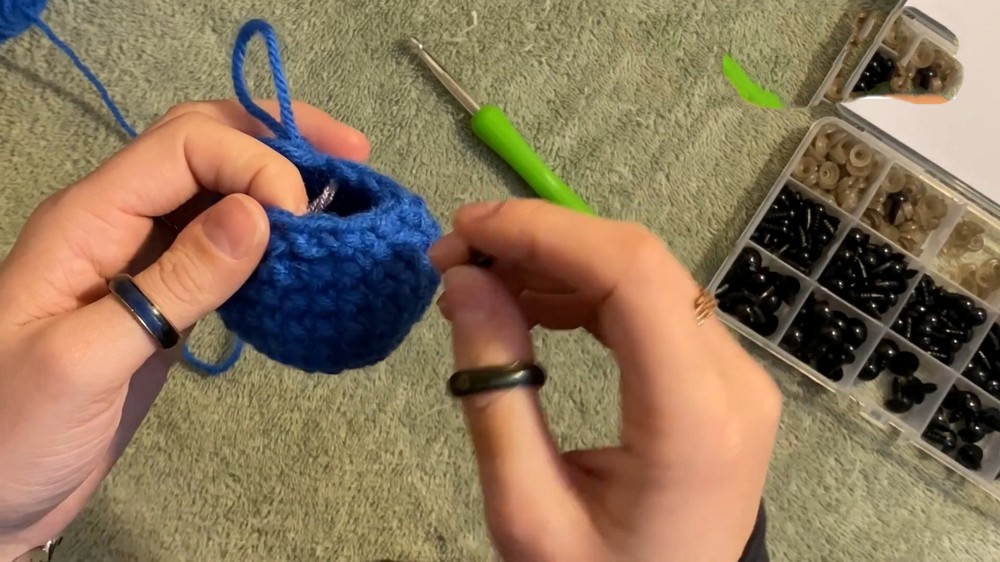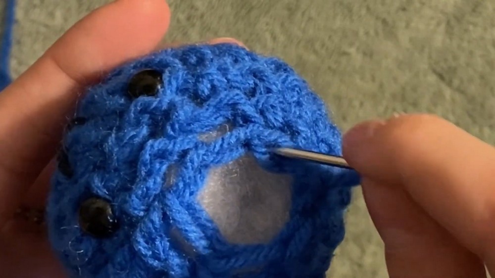 - Plastic safety eyes are attached by pushing them through selected stitches on the blueberry.