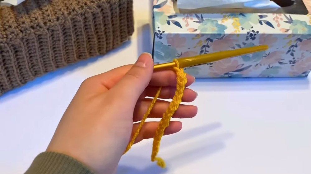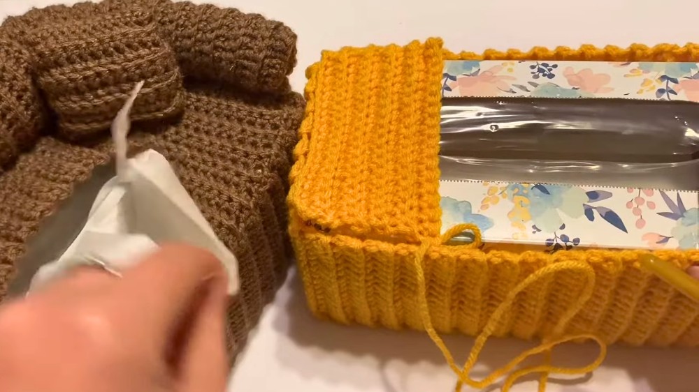 - Start the top panel by crocheting a rectangular piece that reaches the same width as the tissue box.