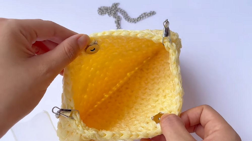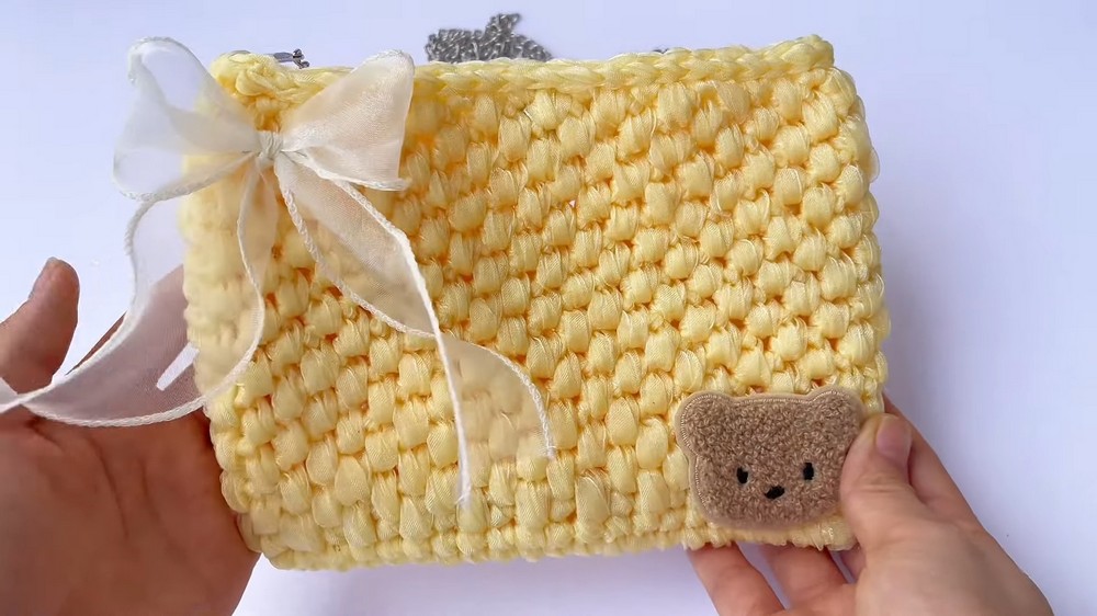 The video begins by showcasing a lovely crossbody crochet bag, decorated with a ribbon bow and teddy bear charm, featuring a side chain and a magnetic button to fasten the opening.