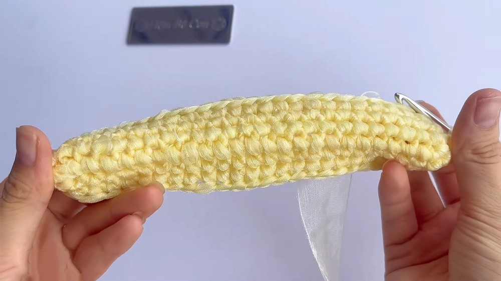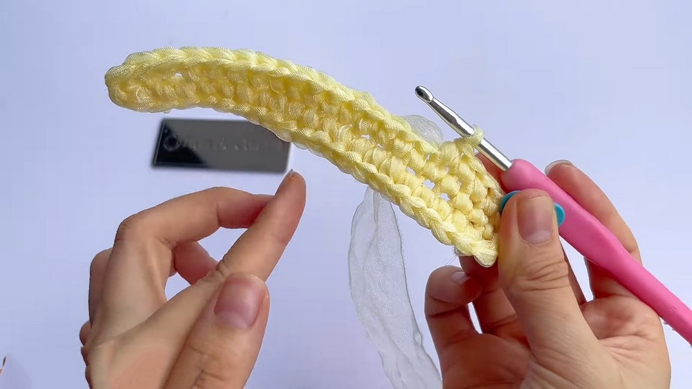 The tutorial starts by chaining 23 stitches. After skipping one stitch, single crochets are made into the second chain from the hook, continuing to create a flat base.