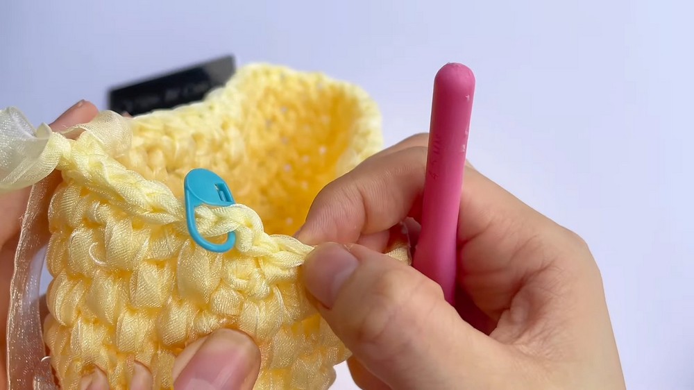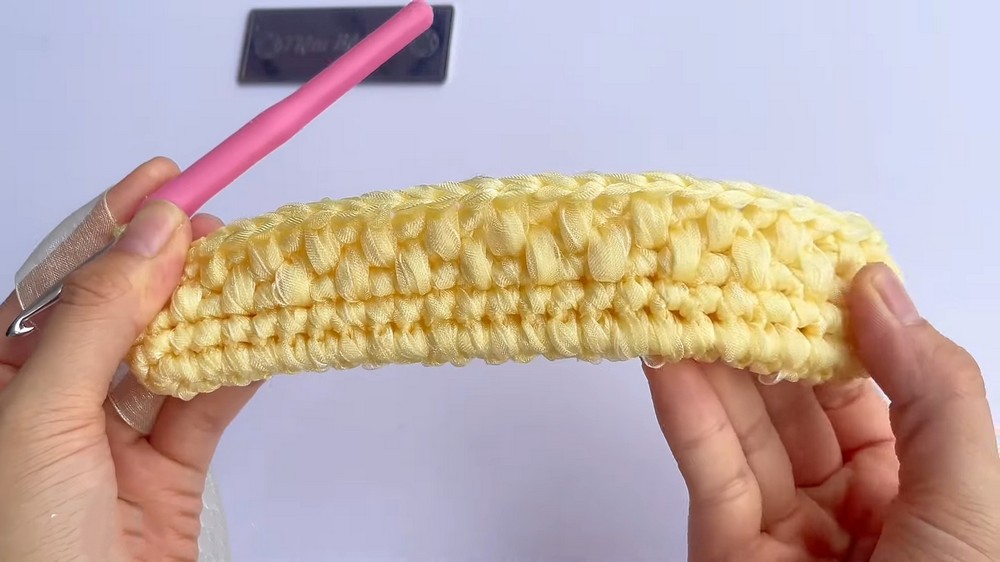 The project uses a 45-meter roll of 2.5 cm-wide ribbon yarn, along with a crochet hook suited for thick, sturdy stitches to form the bag’s base and body.