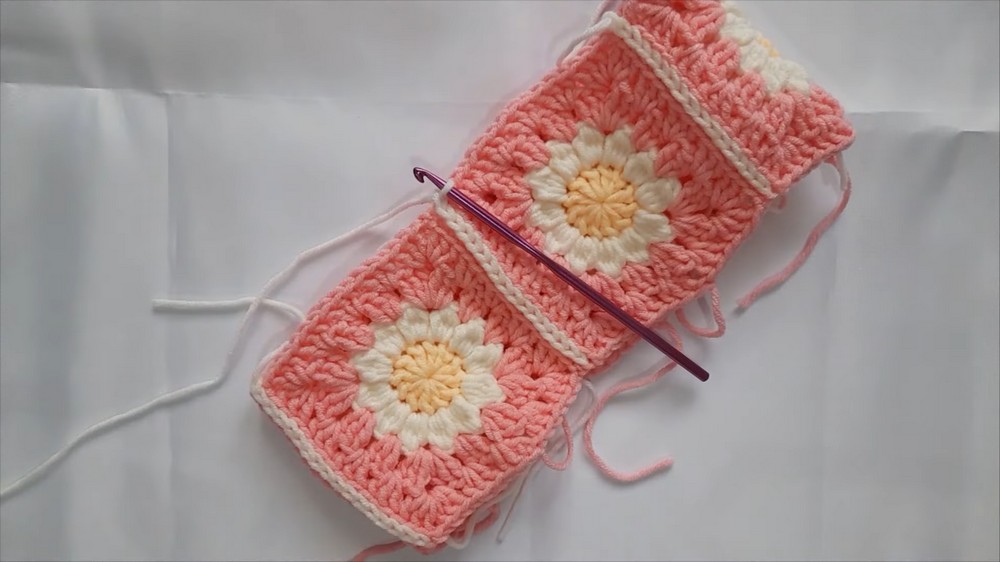 - Begin by attaching white yarn to the bottom edge of the granny square structure.