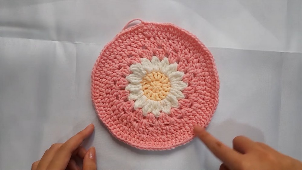 - Create a circular granny square by starting with a yellow center and white petals.