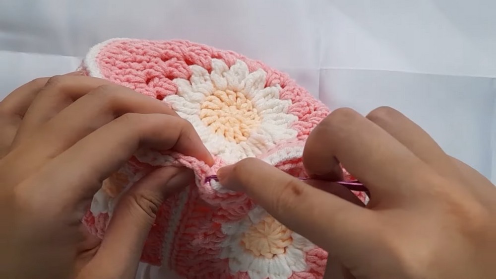 - Attach pink yarn to the spaces between the petals.