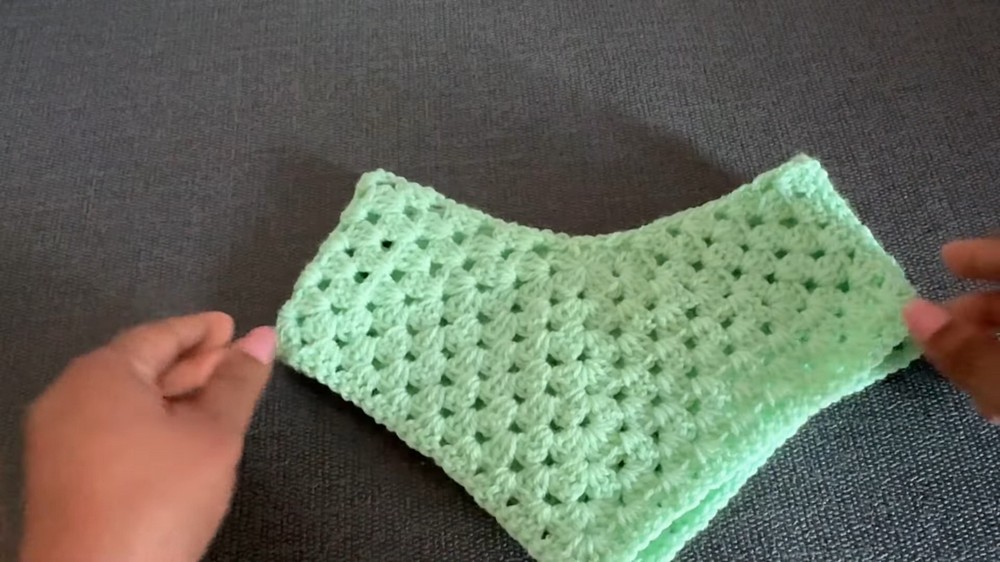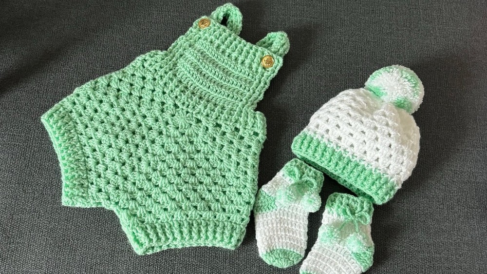 - Two identical crochet pieces are made for the romper and are joined together using a yarn needle.