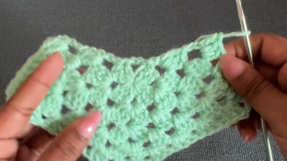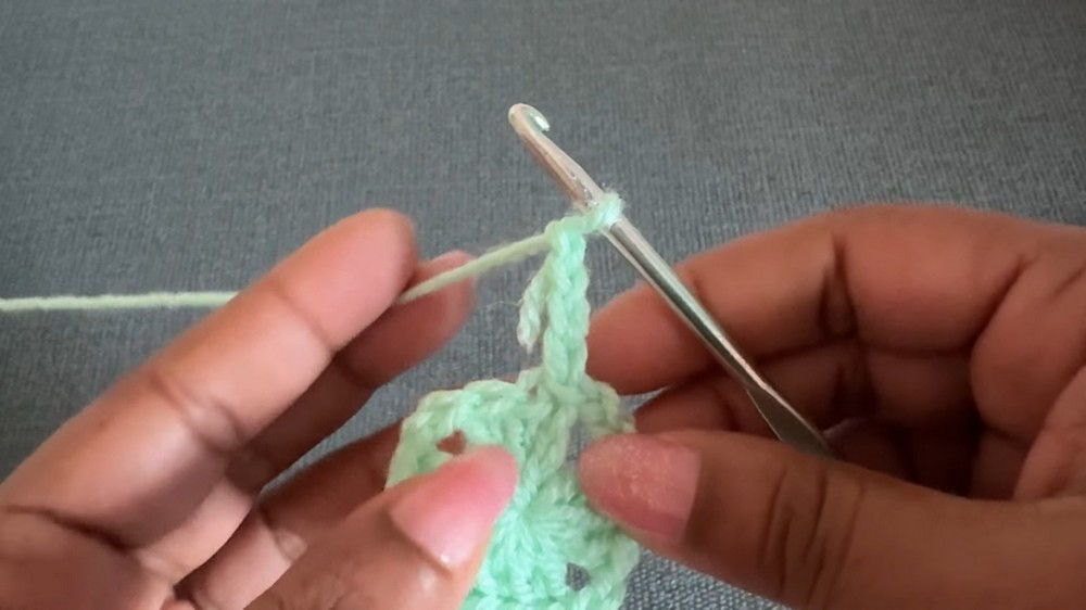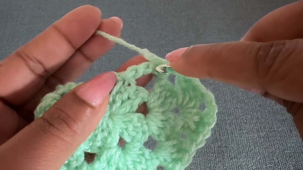 - Four corners are created with chains and double crochets, forming a foundational square grid.