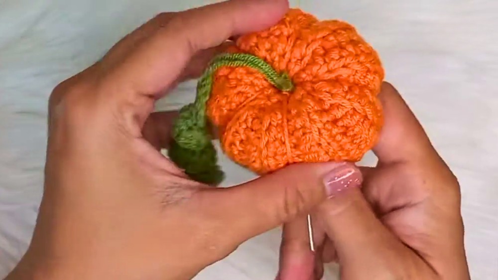 The process begins with a slip knot and a chain. The creator then demonstrates the use of a single crochet stitch worked in the back loop only for several rows, which is what gives the pumpkin its ribbed texture. After completing the rows, the yarn is cut, leaving a long tail for sewing. Using a tapestry needle, the yarn tail is threaded through the last row of stitches to gather and close the sides of the pumpkin piece, forming a tube. The tube is then stuffed with cotton, and the top is sewn closed and gathered. The creator then shapes the pumpkin by threading the needle through the center and wrapping the yarn around it to create the distinct segments of a pumpkin.