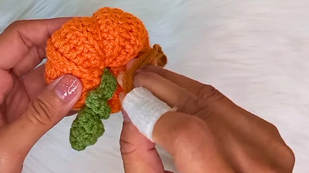 The final step is to assemble the keychain. The stem is attached to the top of the pumpkin using the yarn tail and needle. The leaf is also attached, and the remaining yarn ends are hidden. A key ring is then threaded through the top of the pumpkin using a crochet hook, completing the project.