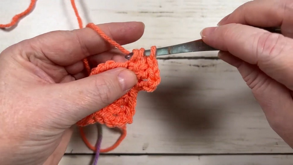 - The second row begins with a chain four, which serves as part of the double crochet cluster.
