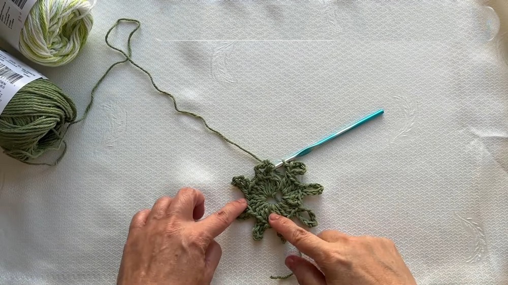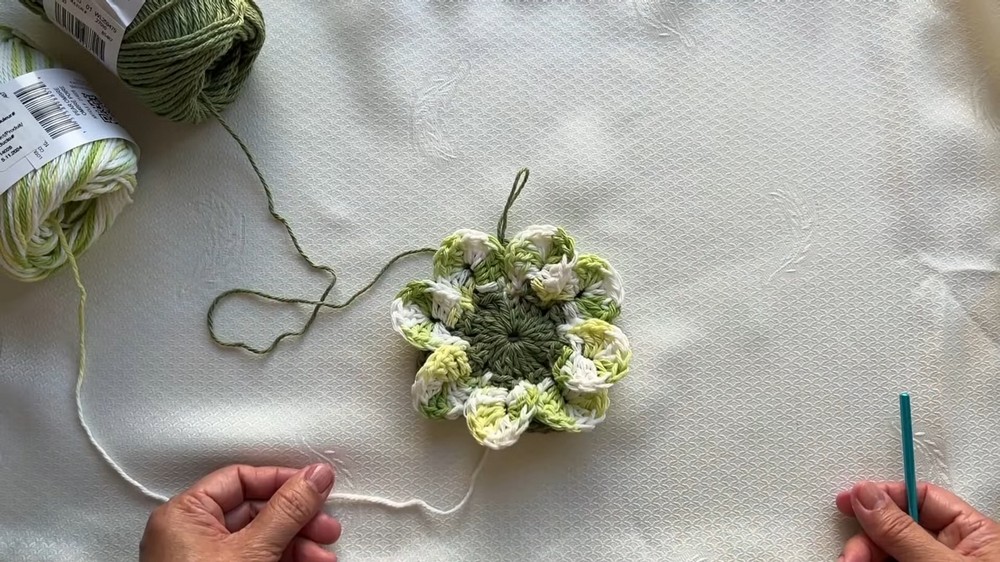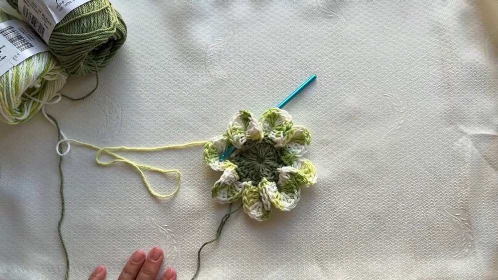 - Switch back to the solid “Olive Garden” yarn for the next round.