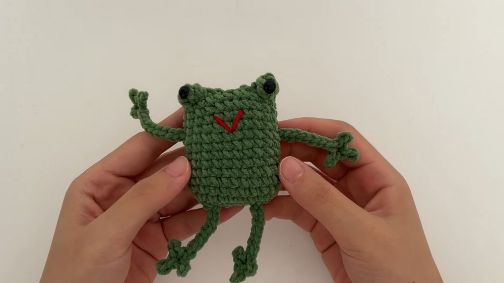- The iconic froggy smile is stitched onto the pouch using red yarn, adding charm and bringing the frog design to life.