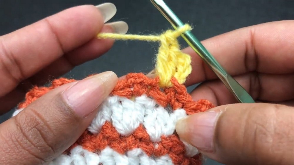 - After completing the first few rounds in white yarn, the pattern includes changing colors to brown and yellow:
