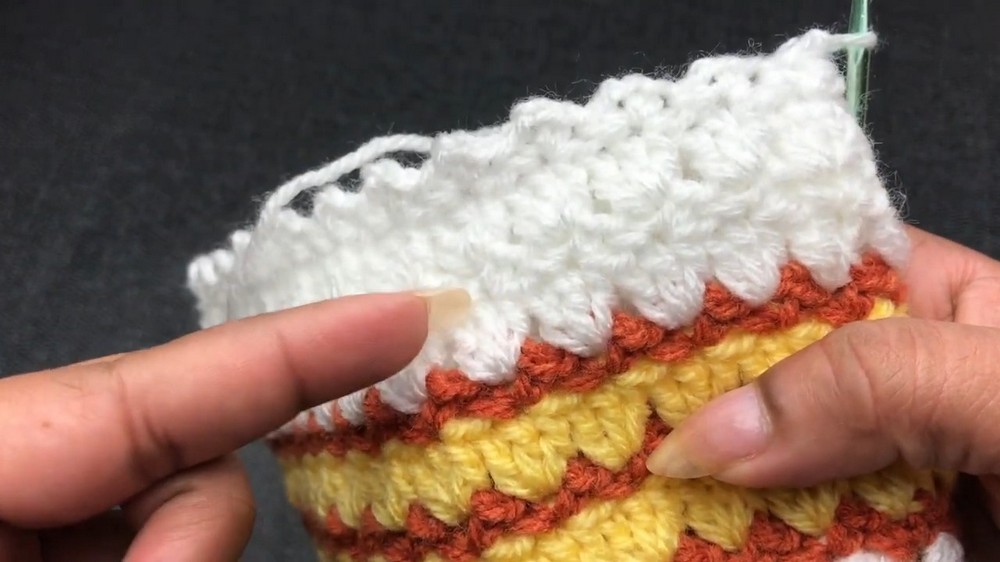 - The creator repeats a two-row pattern structure, switching between white, yellow, and brown yarn to create a visually appealing striped design.
