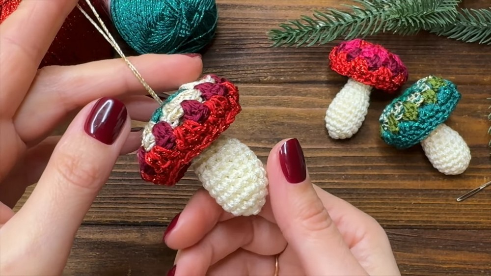 - Fix the mushroom cap onto the undercap, ensuring it is securely fastened. Use slip knots or stitches to connect the pieces.