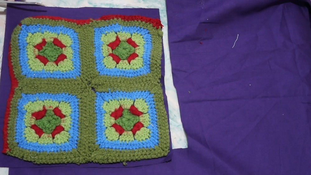 - The lining is prepared by cutting two panels and one strip based on the size of the crochet panels.