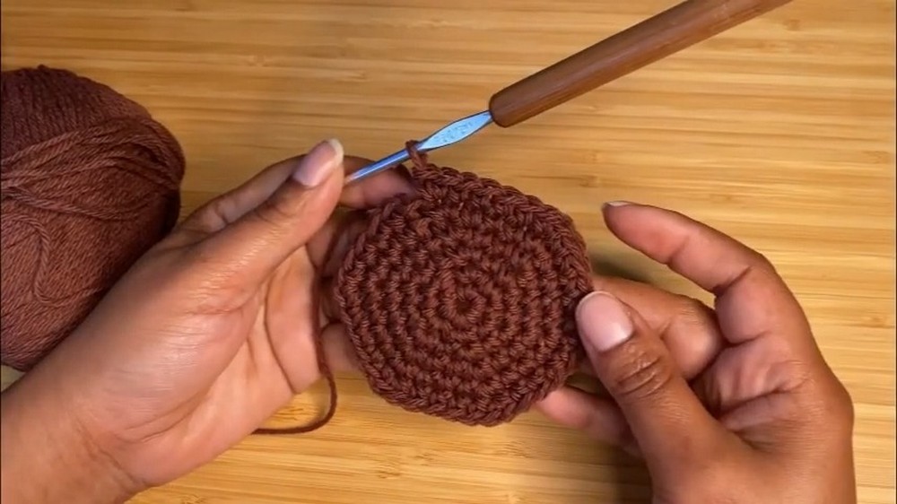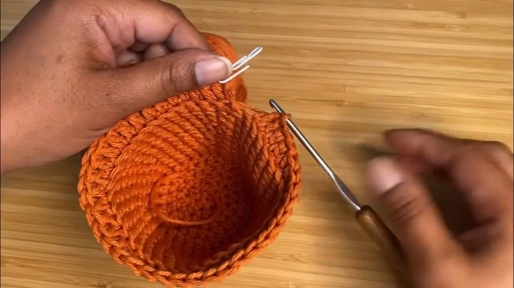 - Once the desired height is achieved, a rim is added by double crocheting through the back loops of the final row.