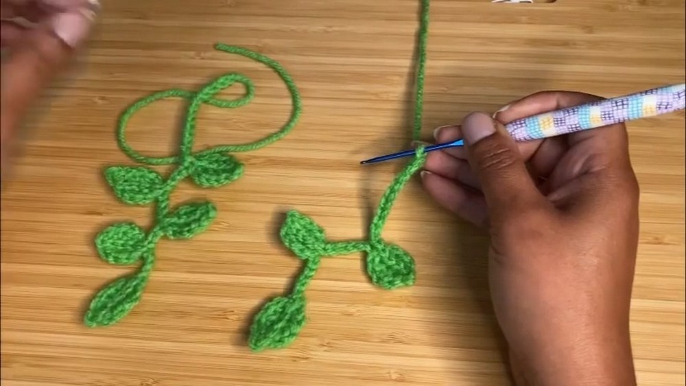- The leaves are created with green yarn, and a smaller hook is used to ensure tighter stitches for a more delicate look.