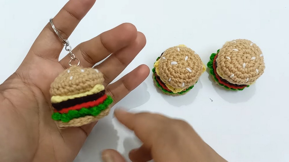 With a tutorial, learn how to crochet an adorable burger keychain using crochet techniques for all skill levels. In a step-by-step tutorial, the creator uses four-ply wool and crochet tools to form different layers of the burger, including the bread, patty, vegetables, and cheese slices. The video provides detailed guidance on creating single crochets, magic rings, slip stitches, and assembling the pieces.