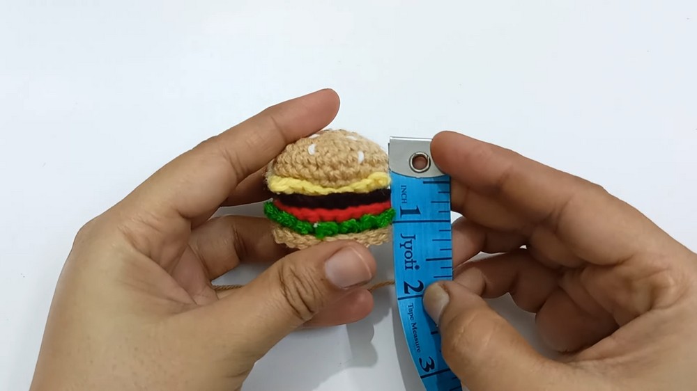 The final size of the crocheted burger is slightly more than 1 inch in height and a little less than 5 inches in circumference.