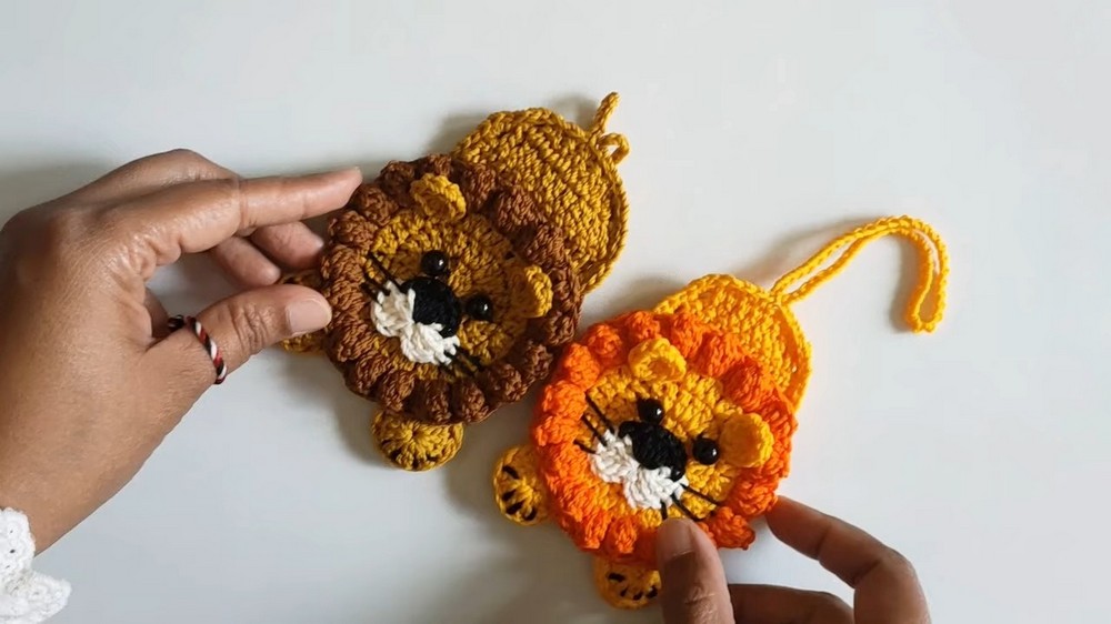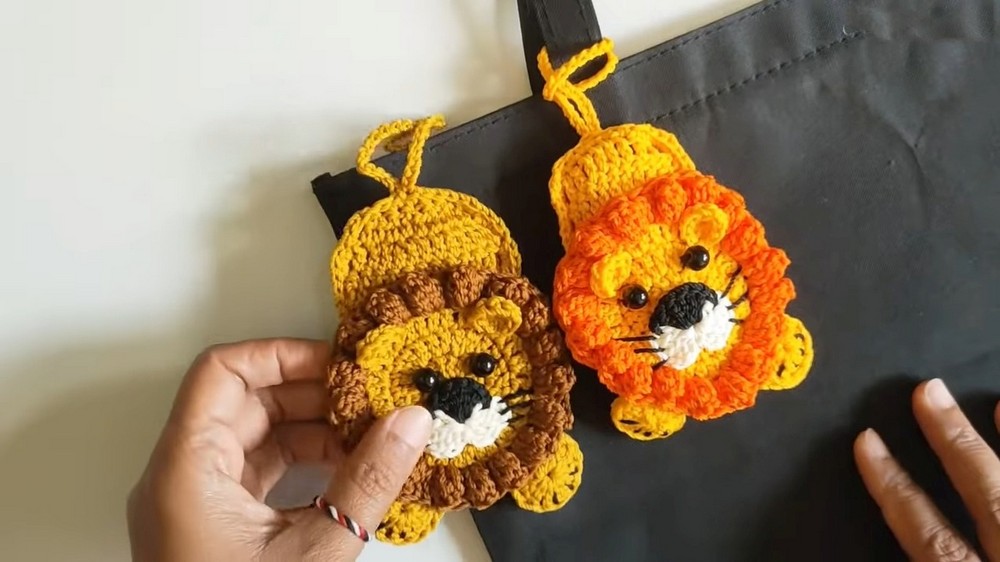 - The final product is a detailed, lion-shaped crochet envelope that can double as a bag hanger.