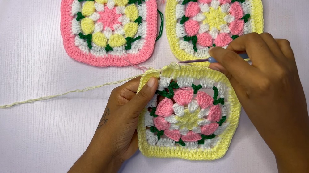 - The tutorial guides users to create a single square, providing specific instructions on yarn switching and color placement round by round.